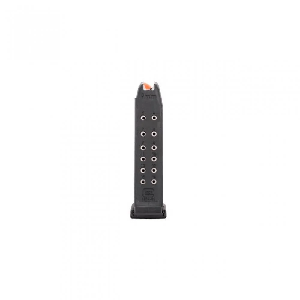 Оригінальний 15-зарядний магазин для пістолетів Glock 19 Gen 5 у калібрі 9mm. Оснащений яскравим помаранчевим подавлювачем для кращої видимості та полімерною підставкою для зручного вилучення.